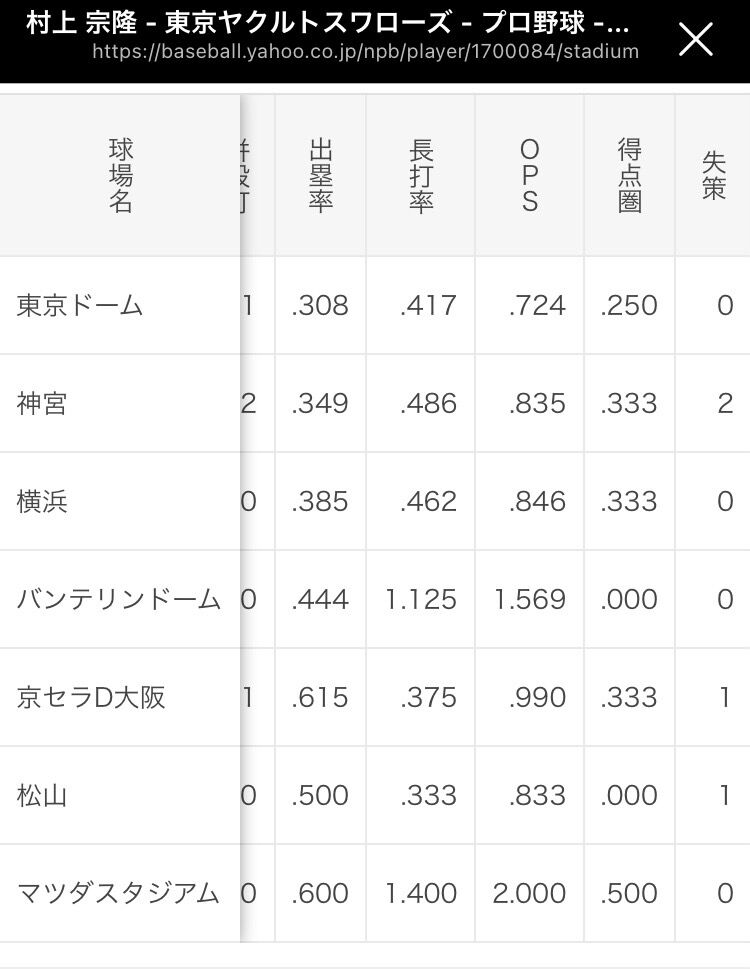 村上(23) *27試合 .297 *6本 *20打点 OPS_0.983