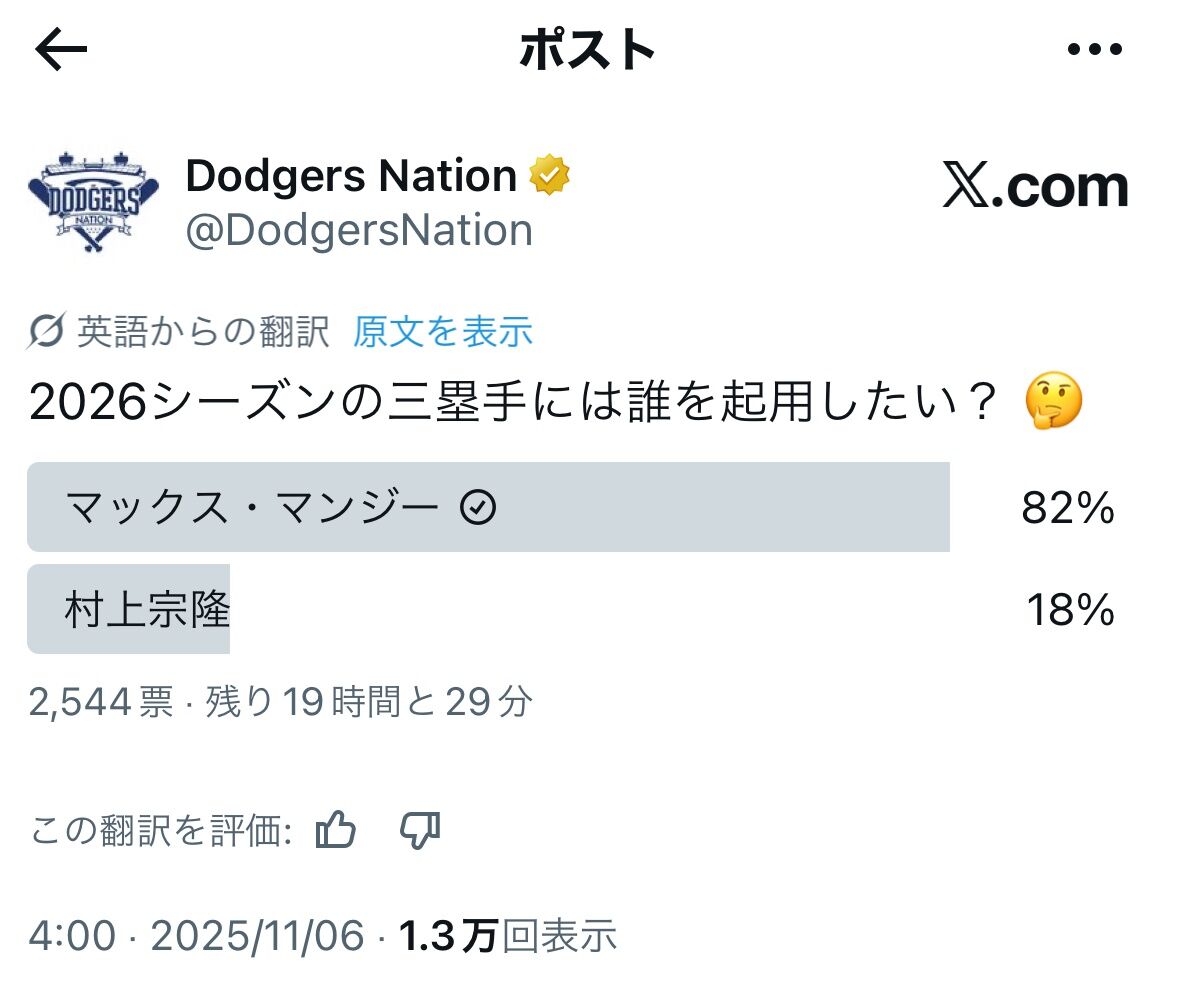 ドジャースが2026年の三塁手候補としてマンシーと村上を比較。守備力や実績の違いから、ファンの間でマンシー支持が優勢。村上の評価も賛否が分かれる。